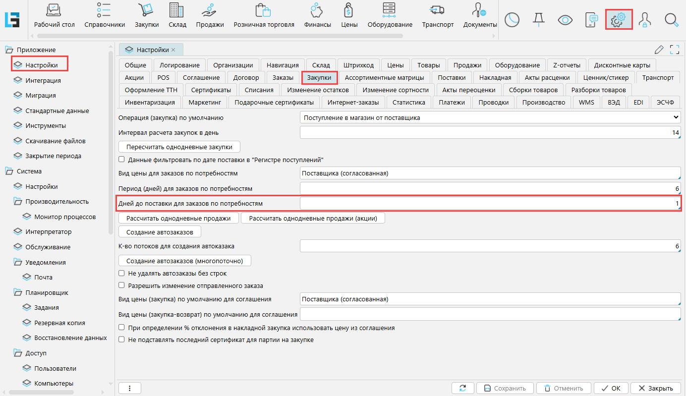 - Количество дней для расчета однодневных продаж - период (с текущей даты по текущая дата - указанное количество дней), за который анализируется реализация товаров. Если этот период не задан, то расчет среднедневных продаж не будет выполнен.