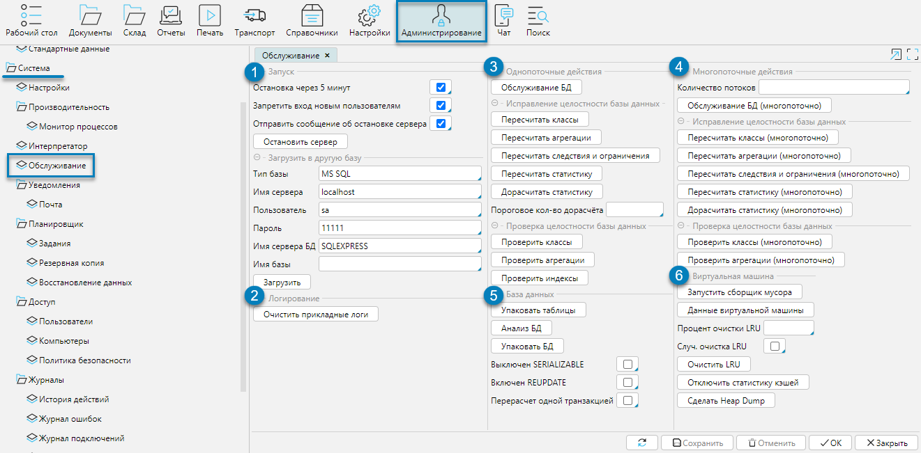 На форме Администрирование - Система - Обслуживание можно выполнить ряд действия для поддержания оптимальной работоспособности системы.