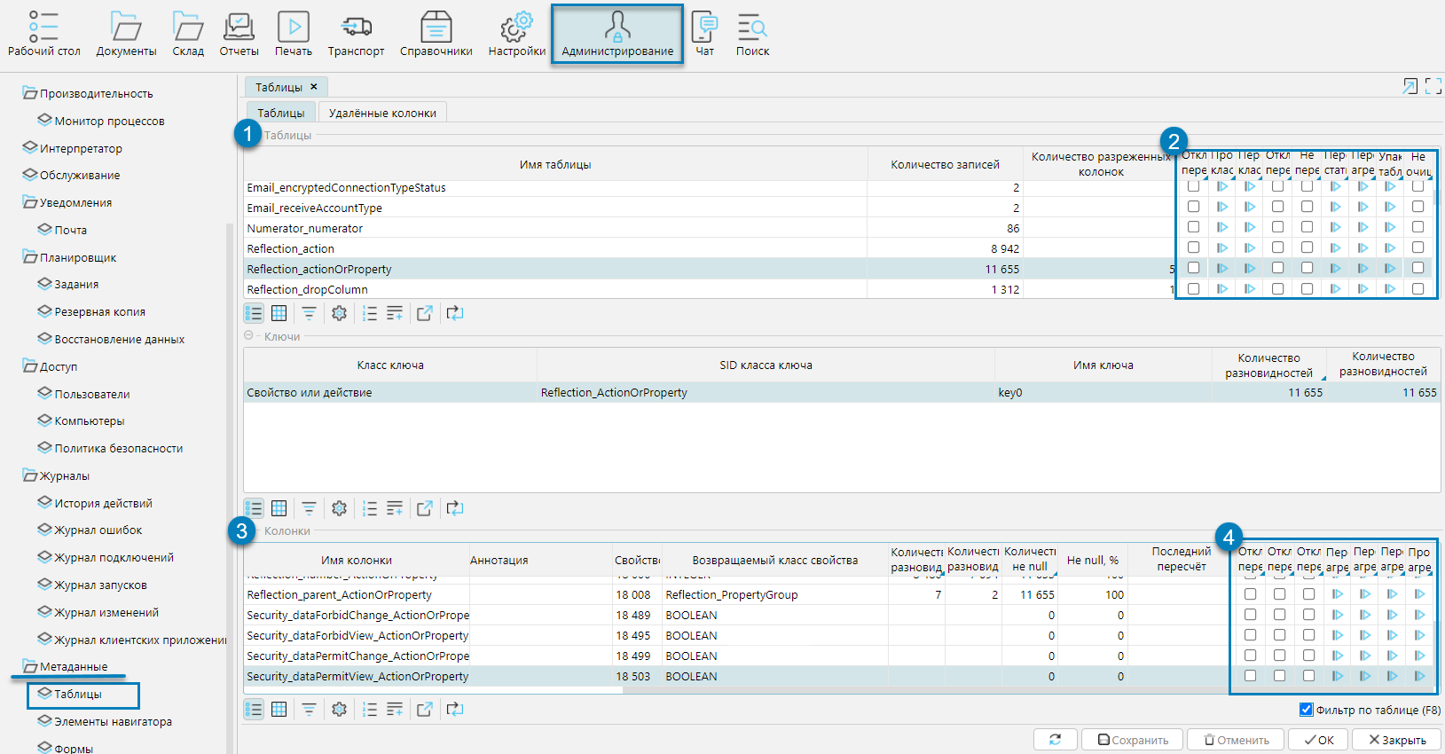 Ряд действий по обслуживанию БД может быть выполнен на отдельных таблицах и даже для отдельных колонок на форме Администрирование - Метаданные - Таблицы.