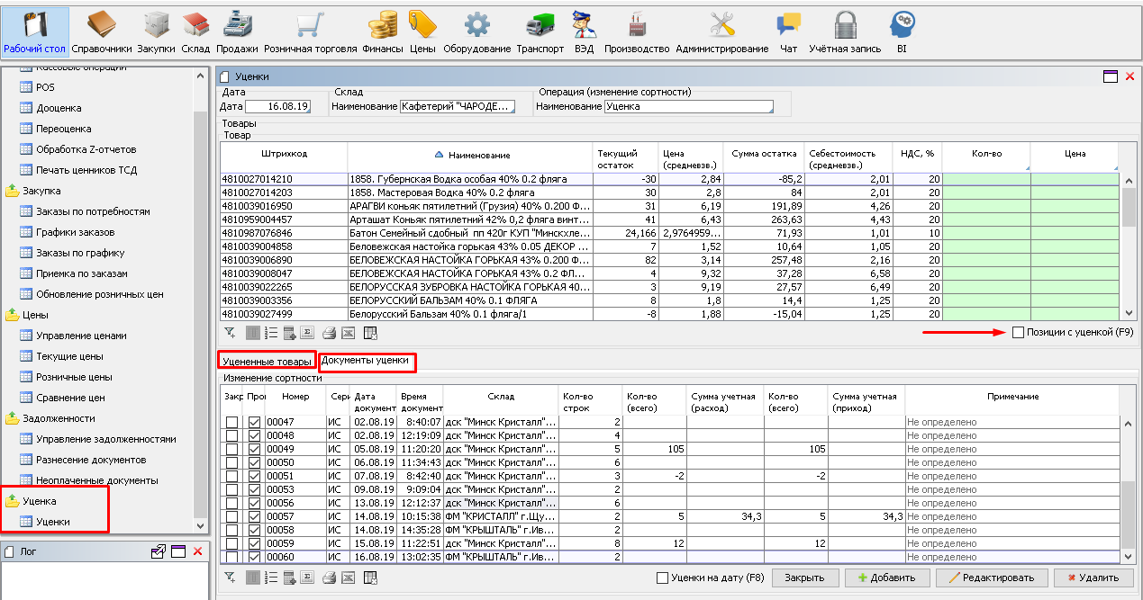 Документы уценки товаров, создаются автоматически при создании документов Изменение сортности товара в журнале Склад\Изменение сортности