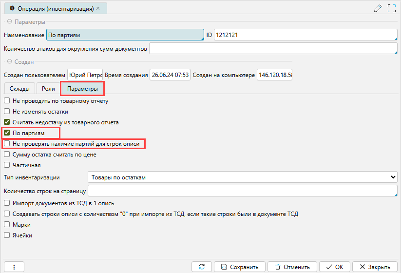 Не проверять наличие партий для строк описи - нужно отметить в том случае, если опись товара создается без указания партий, и партии расписываются автоматически при заполнении сличительной ведомости. Признак становится доступным (только в настройках операции), если отмечено По партиям.