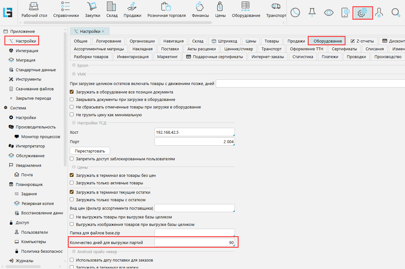 Чтобы выгружать партии товаров в ТСД. Для этого на форме Администрирование - Настройки на вкладке Оборудование в поле Количество дней для выгрузки партий установить период в ТСД, за который в ТСД будут выгружаться партии товаров.
