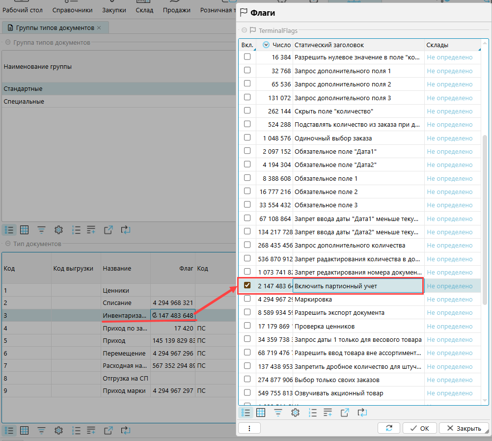 Чтобы создавать опись на ТСД с указанием партий нужно:
