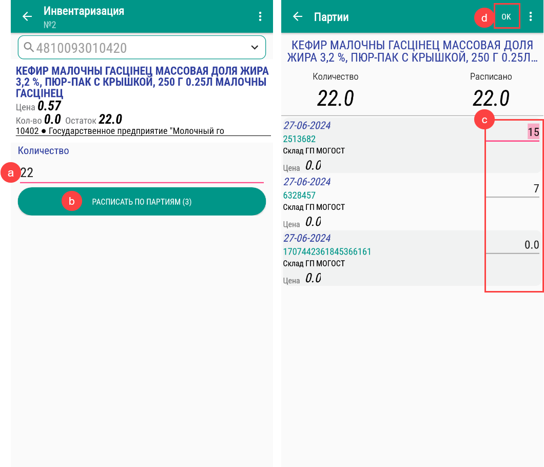 - на ТСД отобразятся все загруженные партии товара, для каждой нужно установить количество остатка,