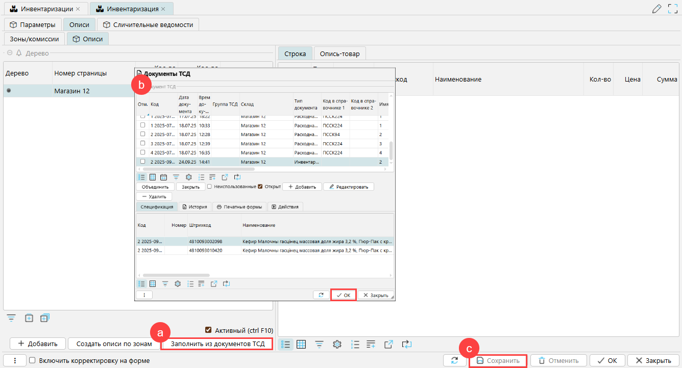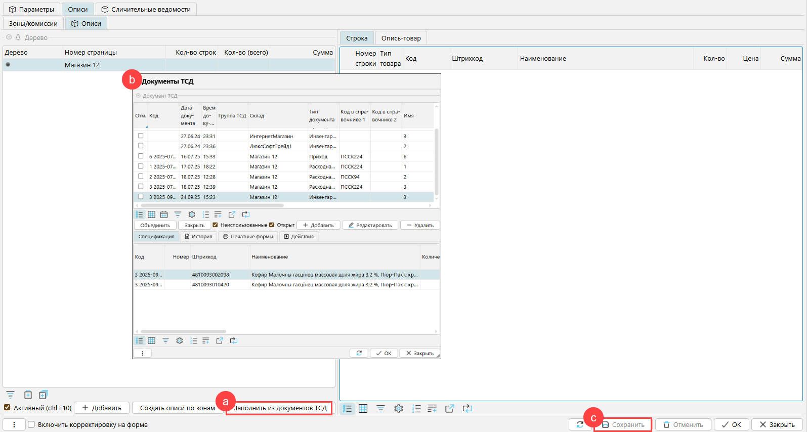 - На вкладке Описи инвентаризации, нажмите кнопку Заполнить из документов ТСД, затем выберите из списка нужный документ и Сохраните опись (рис. 4). В опись будет добавлена страница с товарами с указанными партиями. (рис. 5)