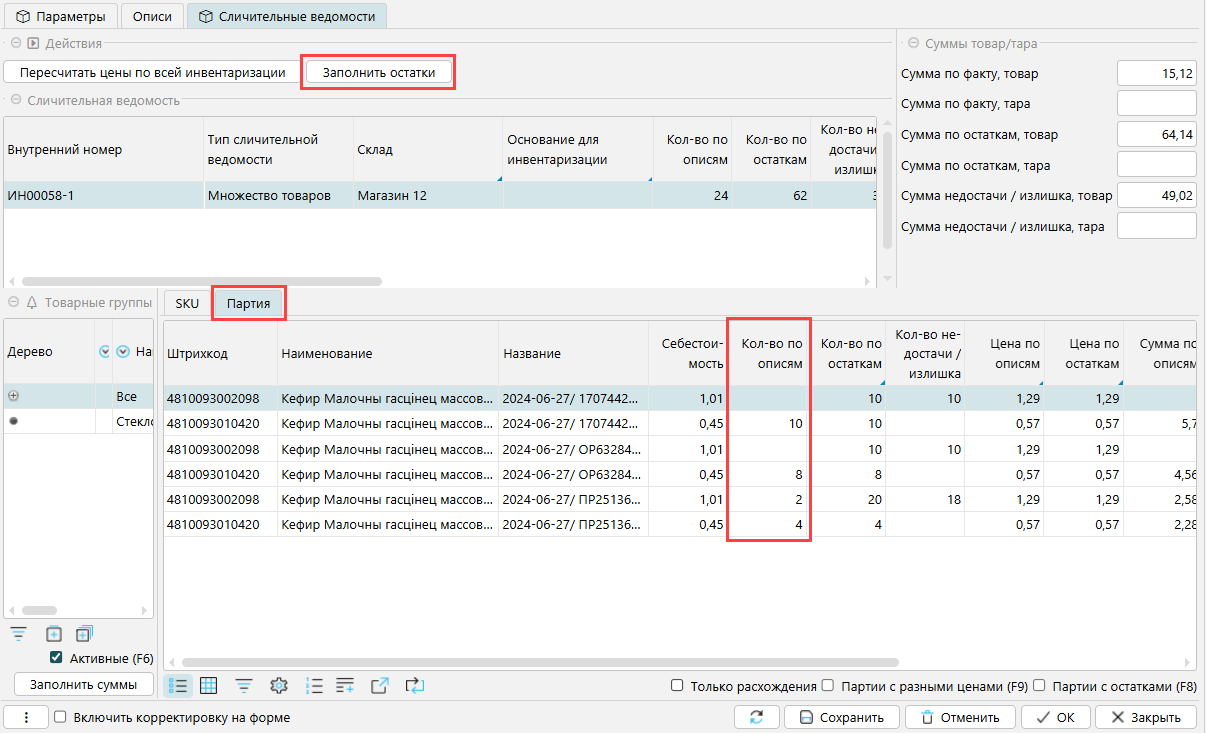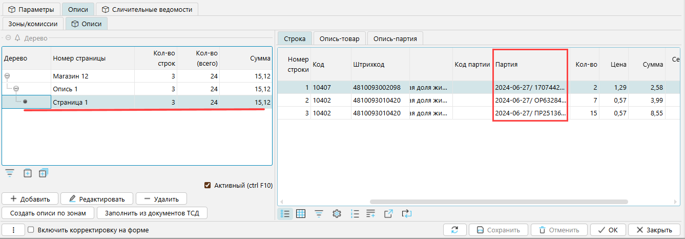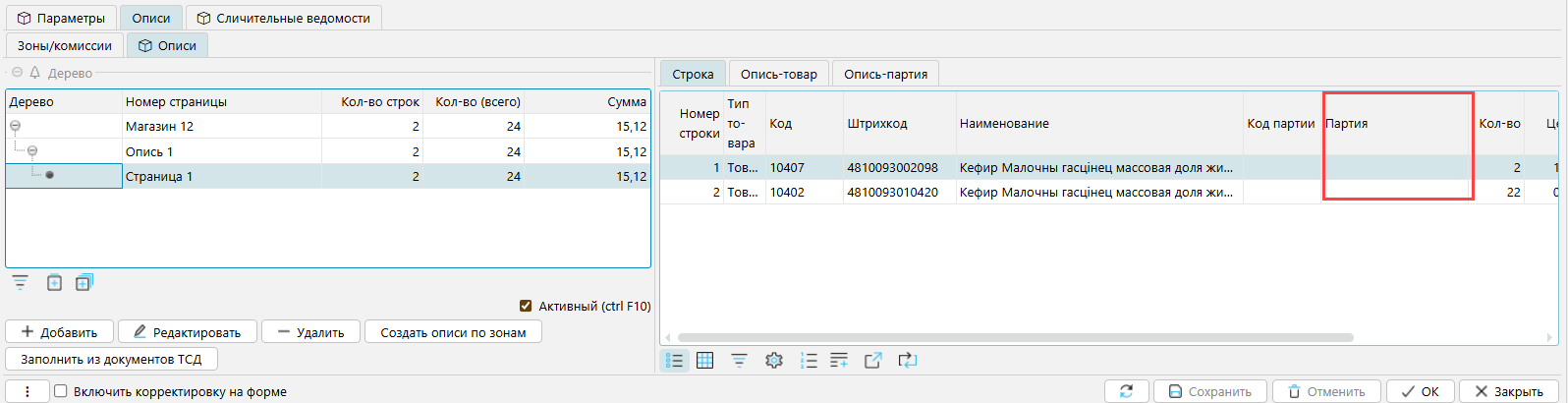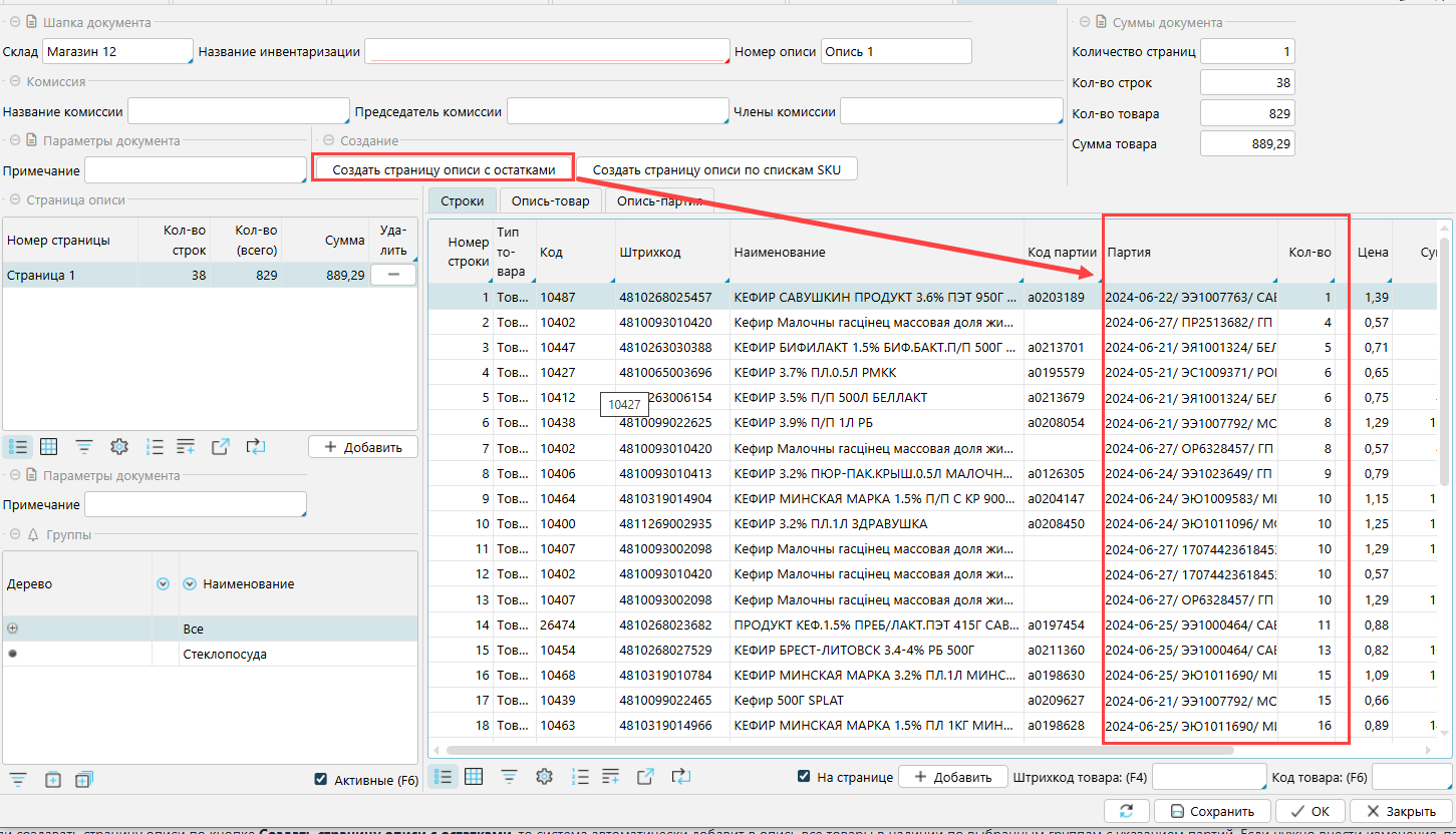 Если создавать страницу описи по кнопке Создать страницу описи с остатками, то система автоматически добавит в опись все товары в наличии по выбранным группам с указанием партий. Если нужно внести изменения, партию можно изменить вручную.