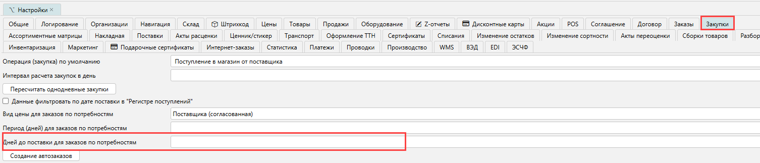 Ряд входных параметров задается на форме Закупки\Закупки\Параметры автозаказа. Параметры могут быть заданы для любого узла основного классификатора товаров.