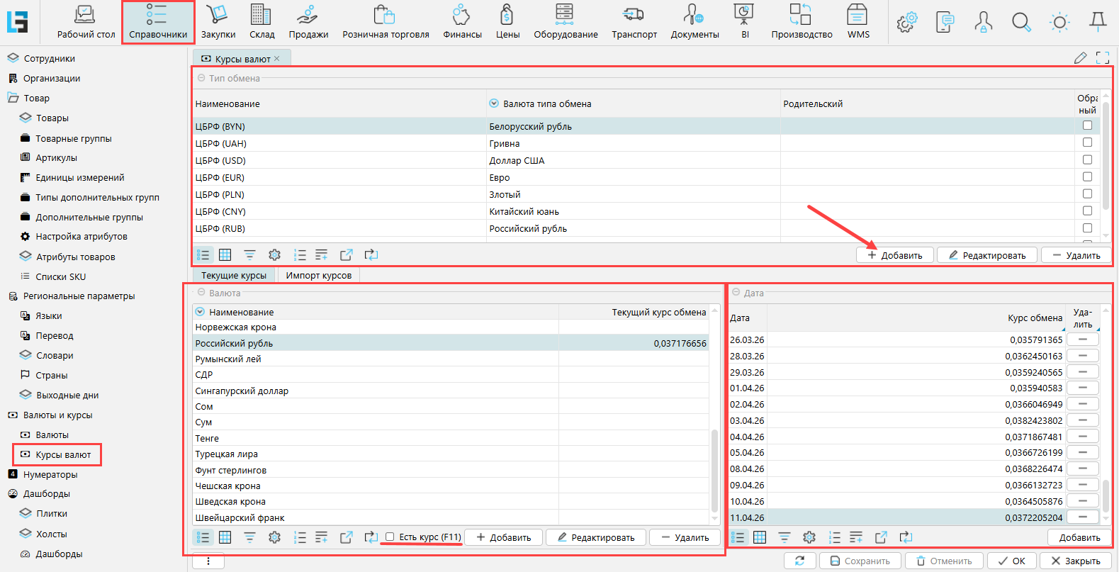 Форма Курсы валют находится в меню Справочники - Валюты и курсы и предназначена для просмотра и редактирования информации о типах обмена, а так же позволяет задавать курсы обмена между валютами на дату и кросс-курсы валют.