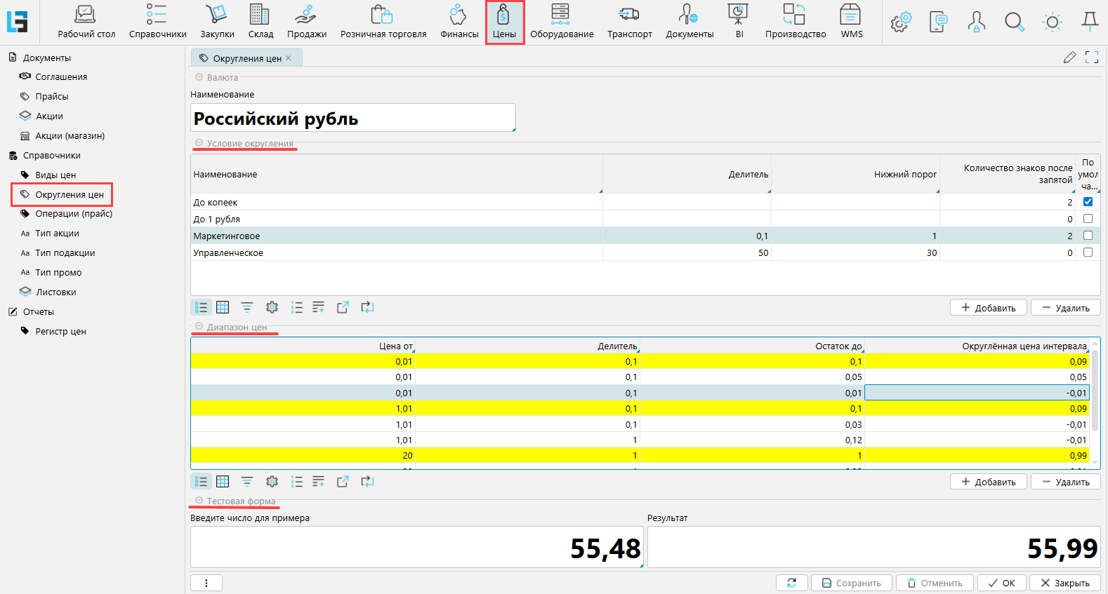 Для того, чтобы проверить, правильно ли настроены правила расчета округлений, можно использовать тестовую форму: в поле Введите число для примера нужно ввести входную цену, а в поле Результат отобразится, как цена будет округлена.