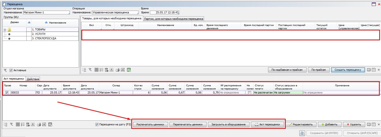 После проведения документа в нижней части формы появится документ Акт переоценки, а в верхней части формы соответственно список товаров исчезнет.